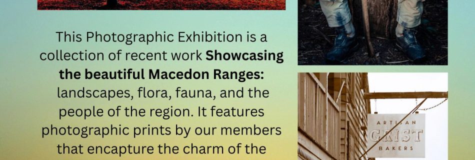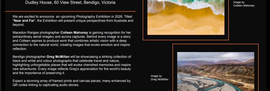 The exhibition will present unique perspectives from Australia and beyond. Colleen Mahoney will present aerial imagery and breathtaking aurora captures, with workshops; Greg McMillan will showcase photographs that celebrate travel and nature, also with workshops; This event is not run by the MRPS club but is promoted on behalf of two of its members.